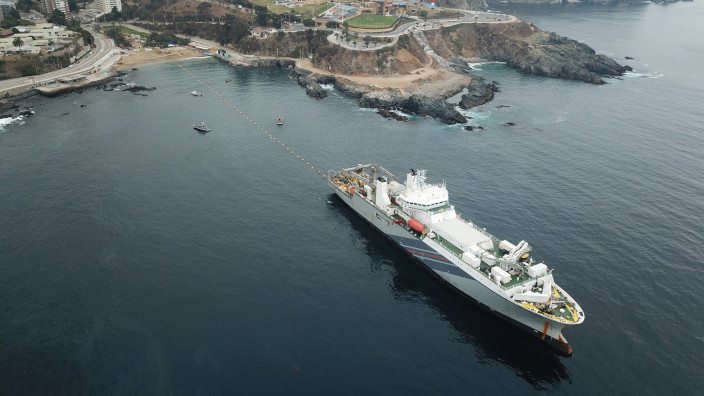 Valparaiso, Chile. 23 abril, 2019. Con una intensa e inédita operación en el sector de Playa Ancha en la Región de Valparaíso, Google y la compañía especializada en transporte submarino de datos, SubCom, finalizaron la instalación del cable submarino Curie, uniendo así a Chile y California a la red de Google.