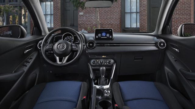Step inside the Yaris iA and you’ll be impressed by what the car offers. There’s a backup camera, Bluetooth, two USB ports, and a 7-inch color LCD atop the center stack. If you want navigation, Toyota says the iA is ready: Just order the navi SD Card from the dealer. (Also look online, where you’ll find cards for $75-$125.) There’s HD radio, but no satellite radio. You control infotainment from the touch screen or the rotary wheel on the console; three function buttons next to the controller take you directly to the home screen, audio, or navigation.