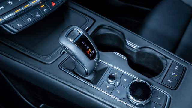 Cadillac XT4 center console with a control wheel, volume control, shifter, and cupholders.
