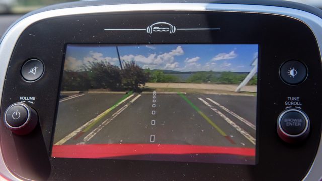 Fiat 500X Pop, $26,235 including the mandatory $1,495 freight charge. It has 17-inch alloy wheels with 60-series tires (relatively pothole resistant), LED running and taillamps, manual-adjust cloth seats, a 3.5-inch instrument panel LCD, the Uconnect audio system with 7-inch color LCD, Bluetooth, 3 USB ports, remote entry, and remote start. A $595 Popular Equipment Group package adds rear parking sonar, tinted glass, satellite radio, and auto-on headlamps. There are no safety or driver-assist packages you can add to the entry model.