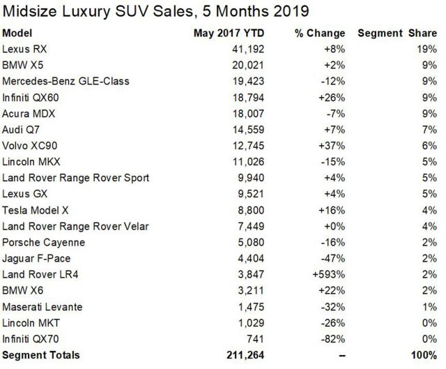 Between the Lexus RX, stretch Lexus RX L, the hybrid RX and RX L, and the sporty RX F; and the more truckish GX, Lexus accounts for one in four midsize luxury SUV sales, a market of about 500,000 vehicles this year. Sales are through May 2018 in the US. (Source: GoodCarBadCar.com)