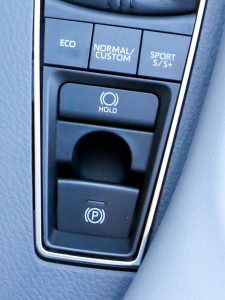 The Mode button on the console behind the shift lever controls throttle response, adaptive variable suspension, power steering, HVAC, noise cancellation, and engine sound enhancement (synthesized in-cockpit vroom-vroom sounds). Hybrid cars also have an EV mode to force the car to electric mode if power is available.