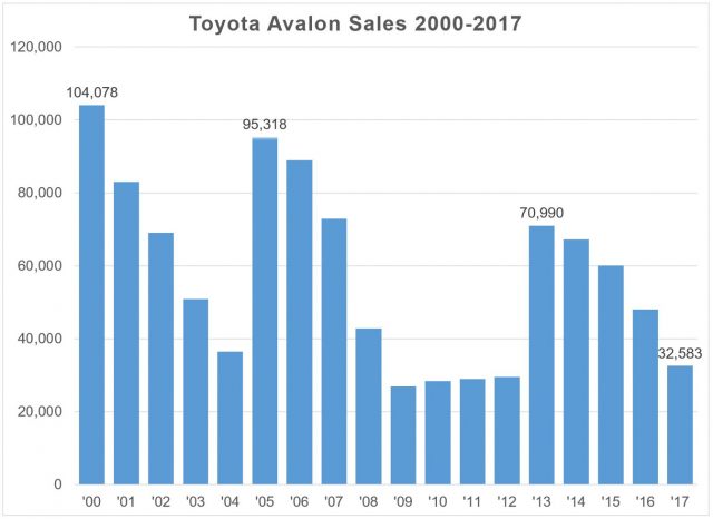 Avalon sales peaked in 2000. Out since 1995, there have been new Avalons for model years 2000, 2005, 2013 and now 2019.