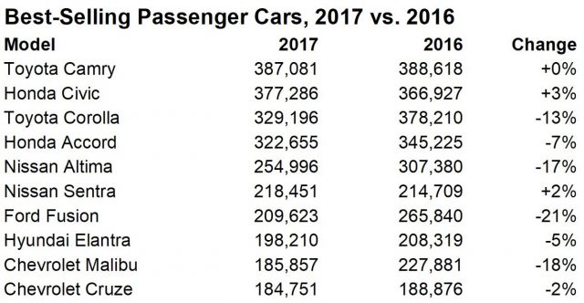Five of the 10-best selling passenger cars (i.e., not crossovers, SUVs or pickups) are compacts: Honda Civic, Toyota Corolla, Nissan Sentra, Hyundai Elantra, and Chevrolet Cruze. The market for cars — all sizes, luxury and mainstream — fell 11 percent in 2017 to 6.1 million in the US.