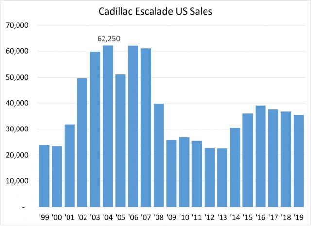 Cadillac has sold 807,000 Escalades in the US since the first one shipped late 1998, with about 50,000-plus shipped each year 2003-2007. Numbers include the EXT pickup sold 2001-2014, amounting to as much as 27 percent of sales the EXT’s first four years. 2004 was the best sales year. The recent high point was 39,092 sales in 2016, followed by declines of 4, 2, and 4 percent the last three years.