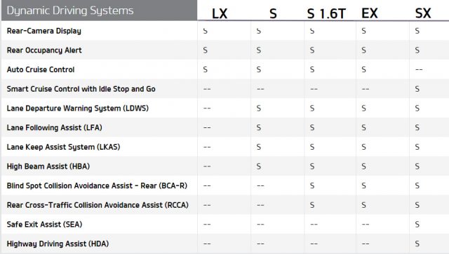 Kia offers a lot of Seltos driver assists, including SAE Level 2 self-driving (called Highway Driving Assist). But as you browse the Kia site, eventually you’ll find most of it is not on the cheapest model. (Minor annoyance: the Seltos’ underwhelming website only lets you cross-compare three of the five trim lines at a time. The table above, from kia.com, was snipped in segments from the site and stitched together in Photoshop. Harrumph.) The entry LX, $23,110 including shipping, with all-wheel-drive, has no driver assists beyond a reminder to check the rear seats when exiting, as well as the federally mandated backup camera. The Seltos S, the same price but with front-drive, adds a front-windshield camera that provides automatic emergency braking, lane departure warning/lane centering, and automatic high beams.