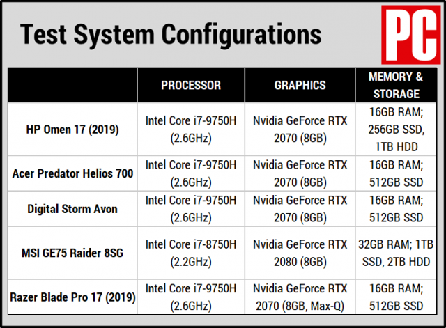 The Razer Blade Pro 17 with its compact form factor is the slowest system in the lineup, but the systems all hang fairly close to each other as most use the same processor. It’s notable, however, that HP’s Omen 17 never manages to pull ahead in these tests, and the Acer Predator Helios 700 and Digital Storm Avon are persistently ahead by a small margin.