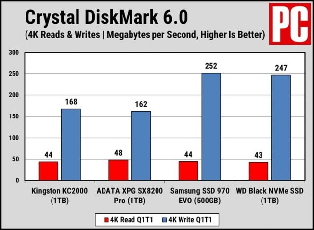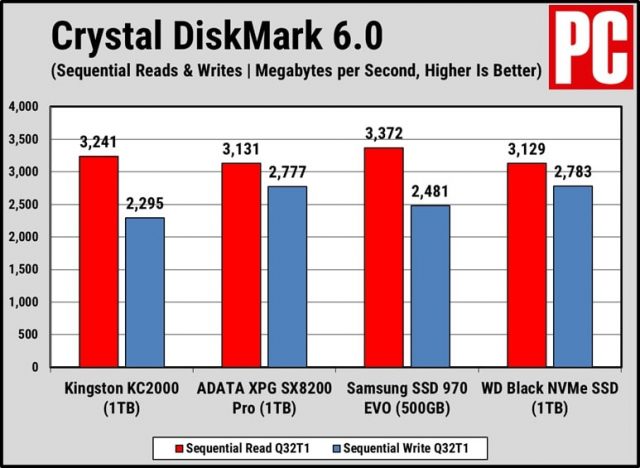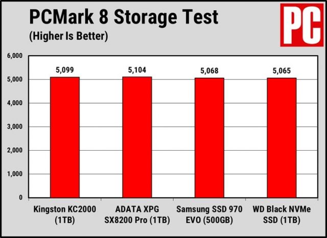 Our sister site PCMag ran a 1TB model of Kingston’s KC2000 through its usual quartet of benchmarks alongside three competing products from Adata, Samsung, and Western Digital. In the first test using PCMark 8 Storage test, we see virtually no difference from one drive to the next.