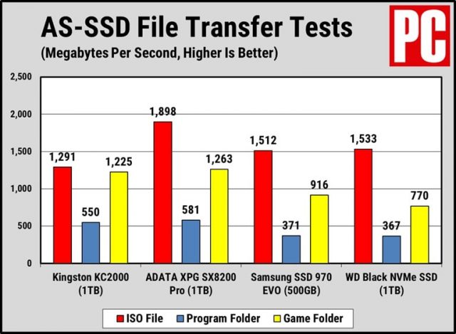 Turning last to AS-SSD’s file transfer test, we once again see the KC2000 in a rather mixed position. The KC2000 came finished in second place while transferring the program folder and the game folder, and its performance results were close to what was achieved by the Adata XPG SX8200. Conversely, the drive’s performance while transferring the ISO file was significantly lower than the other tested drives.