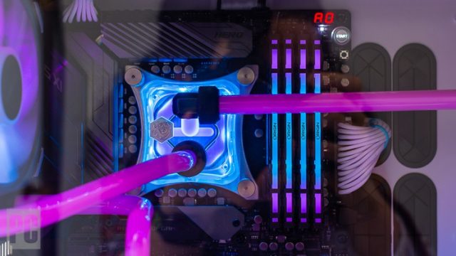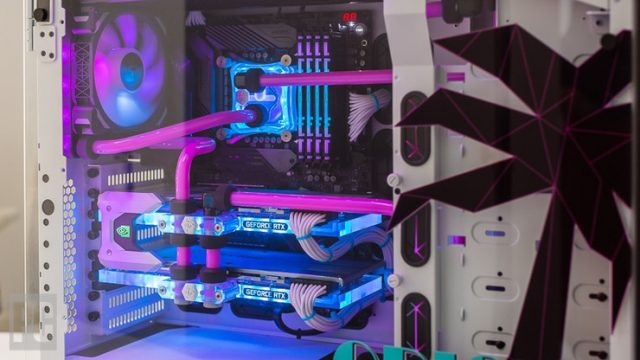 Origin built this system with a hard tube liquid cooling system. Clear cooler blocks are mounted over the CPU and on two Nvidia GeForce RTX 2080 Ti graphics cards. These blocks glow blue and the hard tubes connecting them together glow purple. The RAM also features specialized head-spreaders designed by Origin that have been topped off with blue and purple LED lights.