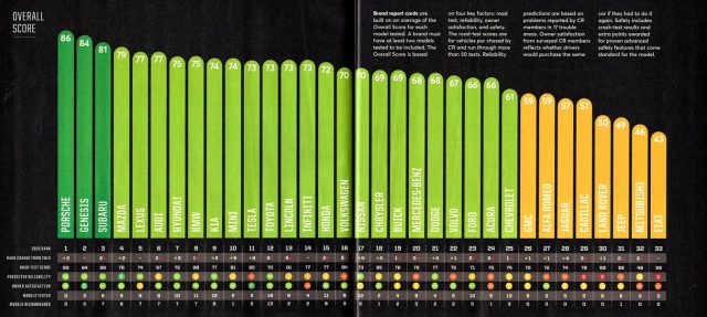 Four brands stand at the top of the annual Consumer Reports car issue. Three of them, Porsche, Genesis, and Subaru all received brand rankings of 80 or more. The magazine gives a recommended rating to every model sold by Porsche, Genesis, and the fourth-highest-scoring brand, Mazda, while every Subaru is recommended except for the WRX.