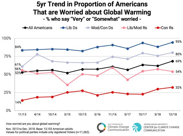 From 2013 to 2018, Americans (on average) worried (very or somewhat) increased from 53% in 2013 to 69% in 2018. 95% of liberal Democrats are concerned and so are a third of conservative Republicans. (Source: Yale Program on Climate Change, George Mason Center for Climate Change Communication.)