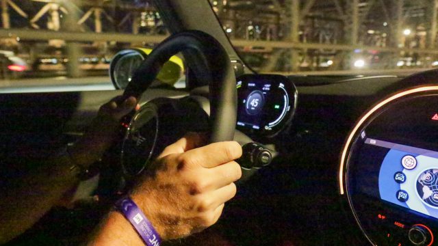 Mini used the occasion of the Formula E race in Brooklyn to invite a dozen auto writers and editors to sample the new car on the 1.5-mile track. (After the professionals were done racing for the day.) Flat-out driving wasn’t possible on the tight track. What was clear was how quick the car accelerated at the kinds of speeds you’d experience building up steam entering a highway on-ramp or getting through a stoplight that just turned yellow. There is very little lean even at the track’s 180-degree hairpin turn.