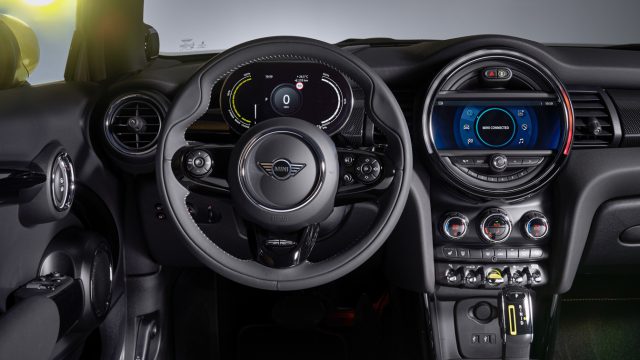 The instrument panel and center stack of the Mini Cooper SE.
