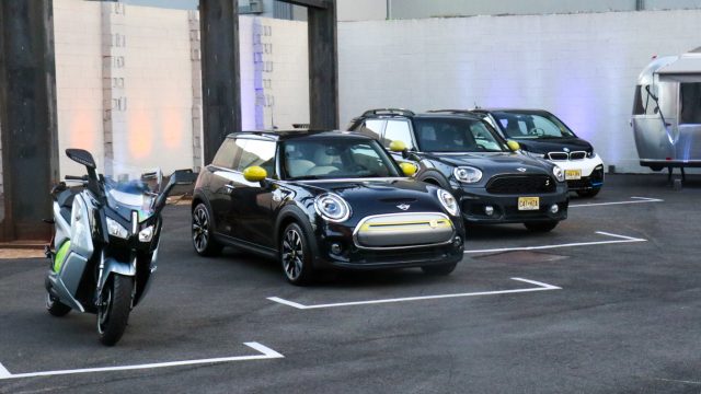 Mini Cooper SE (electric), gas-engine Mini Cooper S, and BMW i3. (Far left: BMW C Evolution electric scooter.)