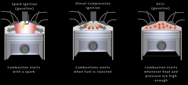 With a traditional gasoline engine, combustion starts when the spark plug fires. With a diesel it’s when fuel is injected. With a homogenous charge compression ignition (HCCI), combustion when heat and pressure are high. HCCI is one of two Mazda SkyActiv-X modes. (Source: Mazda)