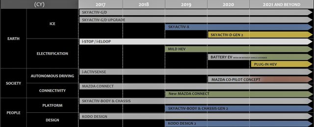 Mazda timeline has SkyActiv-X arriving in calendar year 2019, first hybrids and EVs 2019, and a second-generation Skyactiv diesel in 2020 (US still awaits the first-gen). ICE is internal combustion engine, i-ActivSense includes driver assists and autonomous driving. The SkyActiv-X diesel will be in a new body. Kodo is Mazda’s design language of the car as a living/moving thing, creating a bond between driver and car, or “horse and rider as one [jinba ittai].”