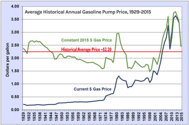 Gasoline is selling near its historical average and is much cheaper than earlier in the 2010s decade.