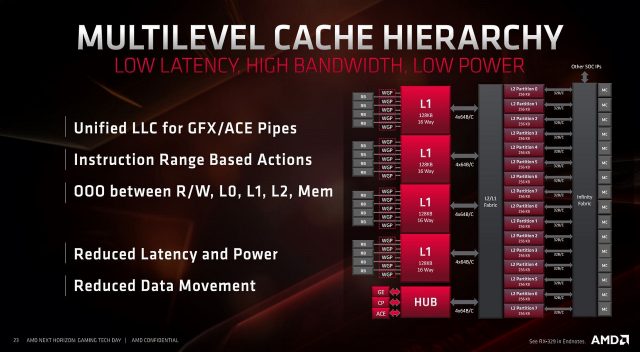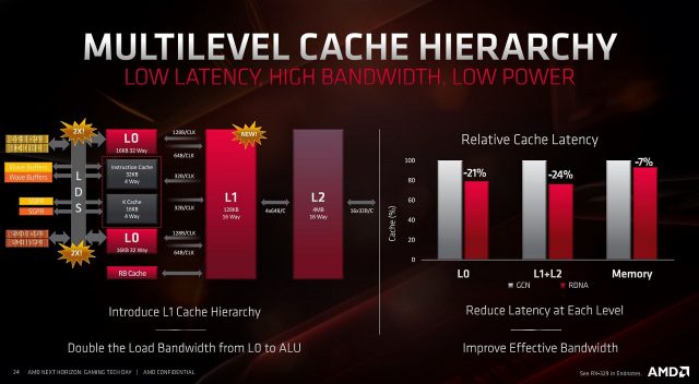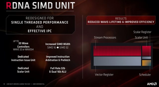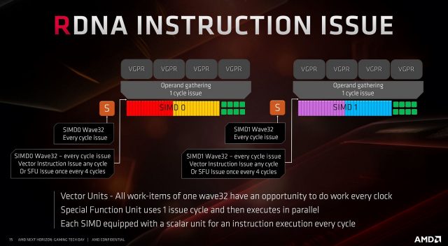 The use of the phrase “CU” to describe this core allocation seems rather odd. AMD is labeling the part this way, with 64 cores per CU, but look at how the diagram above is actually laid out. Each of the red blocks contains 32 subdivisions. This is also true of the GCN blocks, but in that architecture, certain features like the scheduler were shared between the blocks. In RDNA, these capabilities are now specific to each set of SIMD units, and multiple CU units can be ganged together to process workloads in certain cases if the compiler feels this will deliver a performance improvement. We’ve inquired about this to AMD (the initial briefings were extremely compressed, with limited time for questions).