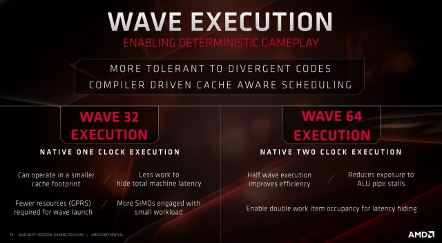 This image summarizes the changes introduced with RDNA. RDNA allows wavefronts to be executed in blocks of 32 rather than 64. A wavefront is a group of operations executed on a single SIMD. Previously, AMD only used Wave64.