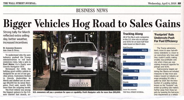 In March, each of the top six auto brands got at least half their volume from pickup trucks and SUVs: Fiat Chrysler got more than 90 percent, Ford and GM got more than 75 percent, and Toyota, Nissan and Honda got more than 50 percent. In March, sales of the new Lincoln Navigator (5,900-6,200 pounds) were up 102 percent, and transaction prices increased by $26,000 thanks to Black Label and Reserve models costing as much as $93,000. The Ford Expedition was also up 46 percent, and the Cadillac Escalade was up 14 percent. In comparison, the Toyota Prius was down 19 percent. The Chevrolet Bolt EV, Chevrolet Volt, and Nissan Leaf each had fewer than 2,000 sales in March.