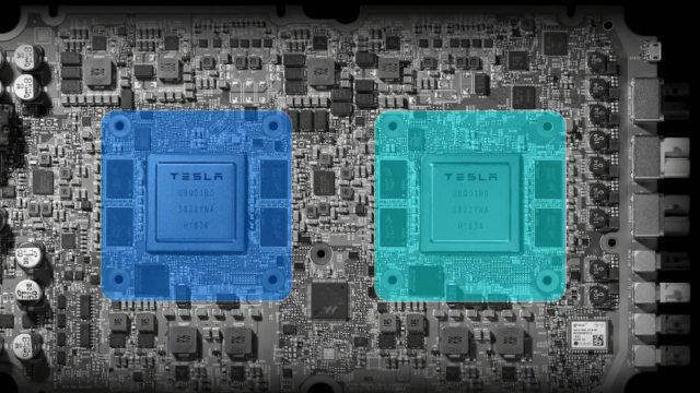 Tesla FSD (full self-driving computer) has two redundant processor cores, each with its own DRAM (let and right of the core), flash memory (below-left of core), and separate OS. At right on edge, 8 video camera inputs. It fits between the glovebox and firewall. (The color is highlighting from the Tesla presentation. Don’t look for it on production boards, okay?)