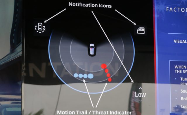 The electronics also pick up people (on civilian cars as well) behind the car. Ford adds icons and motion paths on the center stack display and tracks if the people are moving around the car or if they’re approaching the car. It can sound an alert, or even roll up the windows and lock the car.