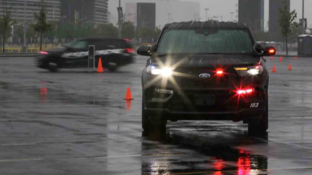 Police Fords get standard pre-collision assists, including emergency braking but with a disable switch in case a pursuit calls for a controlled tap on the back of the car ahead to spin it. That’s called a precision immobilization technique.