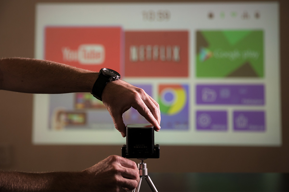 The CINEMOOD 360 is the world’s first 360 degree capable projector for your family. It also holds the distinction of the best-selling projector on Amazon, thanks to its built-in access to Netflix, Amazon Prime Videos, YouTube, AmebaTV and Moolt. It has up to 5 hours of battery life and a built-in speaker, too.
