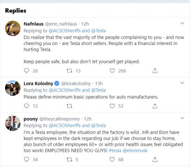 Naturally, this wouldn’t be Tesla without drama and virtual fistfights online. Above is a selection of comments on the stop-production order, saying, for instance, that some vocal proponents of stopping Fremont production are short-sellers of Tesla stock (who make money if it goes down) … that it’s not clear what’s a basic minimum operation (see below) … and that Tesla workers are left in the dark.