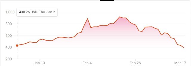 Easy come, easy go: Tesla stock this week is trading at 40% of its peak value, $969, a month ago when the company was worth $140 billion (chart: NASDAQ/Google)